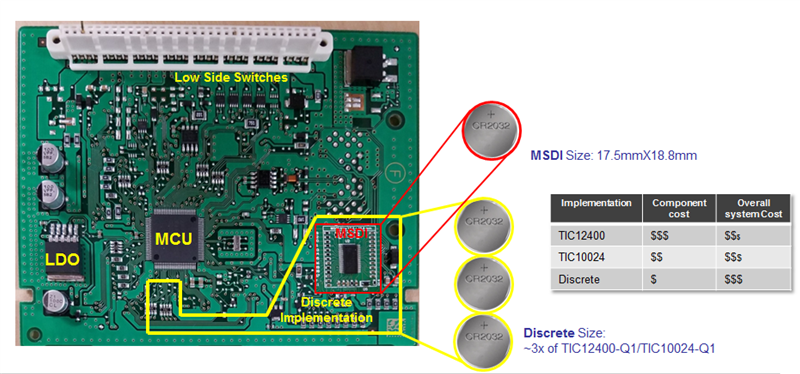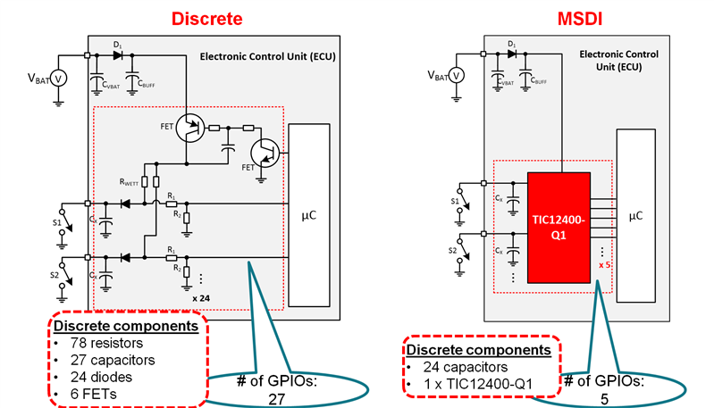 Devices like the TIC10024-Q1 and TIC12400-Q1 enable you to eliminate as many as 120 discrete components; see Figure 2.