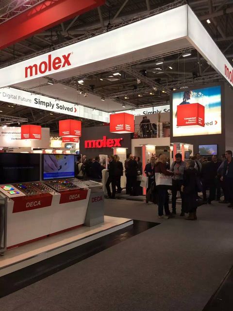 既然亞洲市場最大,為何慕尼黑electronica的展位最大,而不是亞洲例如上海的electronica? 首先因為德國汽車業(yè)發(fā)達;另外展位功能上,慕尼黑展位的會議室多(注:Molex等很多展位搭建了二層,二樓設有會議室),適合客戶/分銷商來洽談溝通;再有,其他廠商展位規(guī)模都很大,Molex也水漲船高。