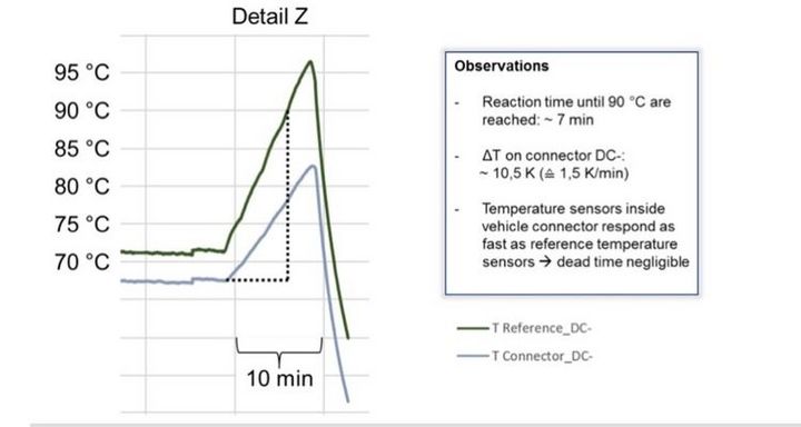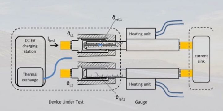 上圖是IEC提出的用以丈量充電插頭的測驗設(shè)備。我們知道,因為我國的直流連接器的公母和歐美日標(biāo)準(zhǔn)是相反的(原因有夠?qū)懸黄獋髌媸返牧?,今日就不多說了)。所以能夠大致能夠以為這個測驗設(shè)備能測驗我們的車輛插座。看一下圖,要害有兩點(diǎn),第一是直埋的溫度傳感器,留意因為這是試驗電路,僅僅用于通過模仿大電流丈量溫度反響,一般電壓只需3,4V所以此刻作為丈量的溫度傳感器是能夠緊緊貼在銅導(dǎo)體上,因而測到實在溫度是精確的。第二是那個HEATINGUNIT,就是一個加熱塊,是用于模仿連接器毛病的。大致試驗進(jìn)程如下,用額定電流,比方400A,通過一段時刻后進(jìn)入熱安穩(wěn),調(diào)整加熱塊模仿事端溫度損壞熱平衡。當(dāng)實在溫度到達(dá)90度時,監(jiān)測丈量溫度是否給出了正確的特性,或許假如是丈量體系則看體系是否有正確的反響,比方堵截了充電電流。