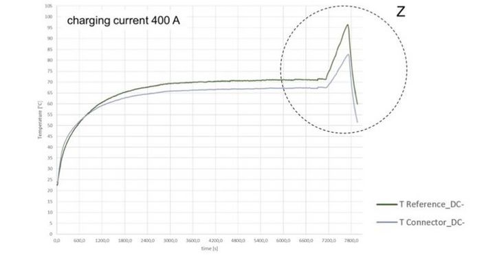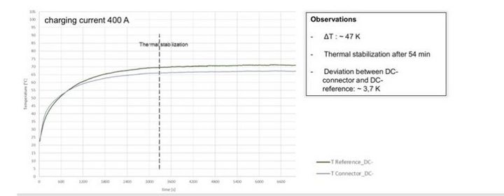看一下上圖,這是一張德國人做的做的某連接器的溫度丈量曲線(順便說一句,文頂用的圖,都是從揭露材料或通過本人贊同答應(yīng)運(yùn)用的圖,不算盜版哈)。這張圖中,TReference是指的觸摸面實踐的溫度,下稱實踐溫度,TConnector是指的連接器上溫度傳感器給出的溫度,下稱丈量溫度。能夠看出來,當(dāng)通過400A電流后,進(jìn)過大約54分鐘,溫度進(jìn)入了安穩(wěn)區(qū),大約為70度出面,此刻那個設(shè)備有一點(diǎn)間隔的連接器給出的溫度是大約67度左右,和實在溫度大約一直有3.7度左右的距離。