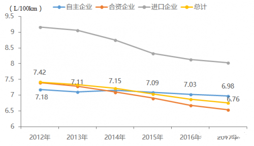 2017年傳統(tǒng)燃油車職業(yè)傳統(tǒng)車均勻燃料消耗量6.76L/100km,較2012年下半年年均下降1.8%。自主企業(yè)傳統(tǒng)燃油車油耗下降相對(duì)緩慢,全體高于職業(yè)均勻水平。