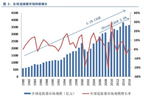 全球連接器市場(chǎng)近 40 年來(lái)持續(xù)增長(zhǎng),據(jù) Bishop&Associate 數(shù)據(jù)顯示,全球連接器市場(chǎng)從 1980 年的 594 億元增長(zhǎng)到 2016 年的 3643 億元,復(fù)合增長(zhǎng)率高達(dá) 5.2%,近十年來(lái)增速放緩,復(fù)合增長(zhǎng)率為 2.6%。 雖然 2014 年之后連接器市場(chǎng)出現(xiàn)暫時(shí)性下滑,但隨之而來(lái)的經(jīng)濟(jì)復(fù)蘇與技術(shù)升級(jí)必將繼續(xù)帶動(dòng)這一產(chǎn)業(yè)向前快速發(fā)展。