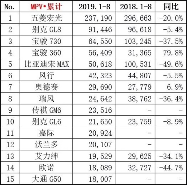 附上2019年8月轎車/SUV/MPV累計銷量TOP15